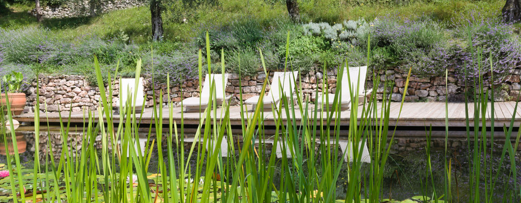 Weitläufiger mediterraner Garten mit Liegewiese unter den Olivenbäumen
